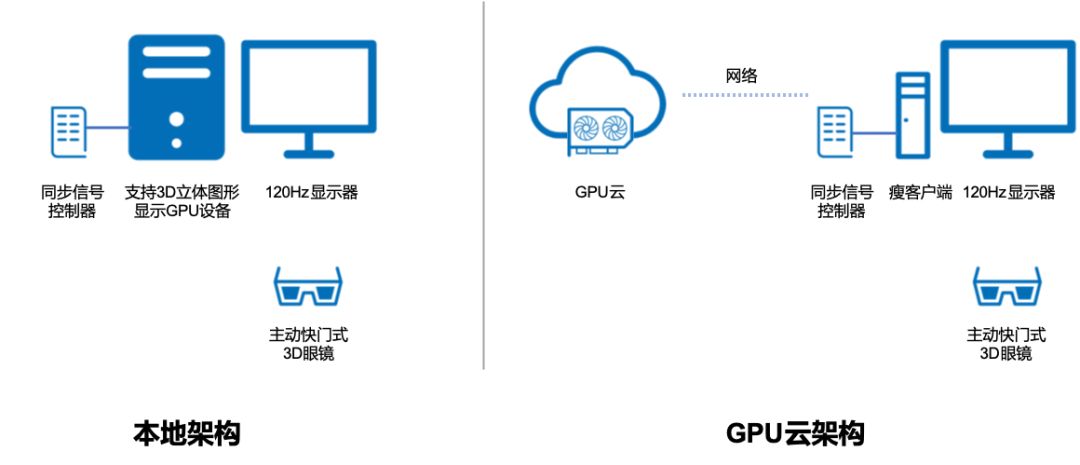 在基于本地设备的主动快门式3D技术实现方案中,整个系统由GPU,120Hz显示器,快门式3D眼镜,同步信号控制器组成。GPU将图形按帧一分为二,形成对应的左眼和右眼两组画面,输出给显示器连续交错显示,每一组画面的频率为60Hz。连接在主机上的同步信号控制器,将获取GPU输出的图形频率信息,控制3D眼镜左右镜片开关的工作频率,使得双眼能够在正确的时刻看到相应画面,从而实现3D立体成像。