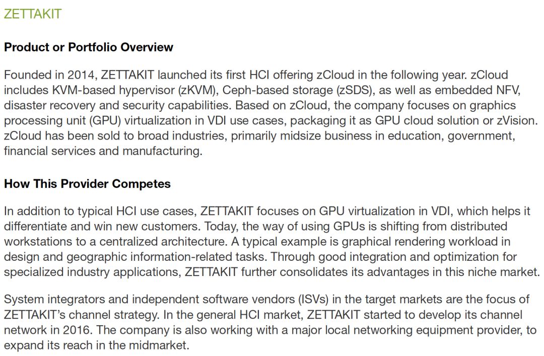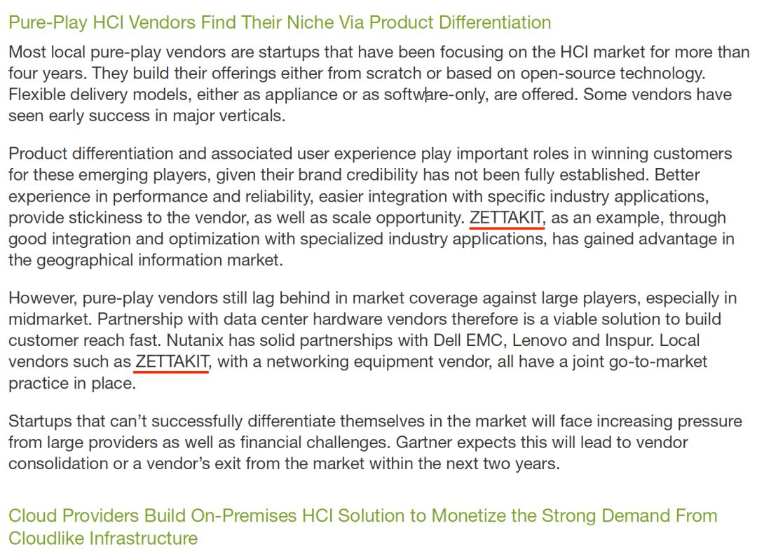 下图截取自Gartner针对国内超融合市场竞争格局发布的报告Competitive Landscape: Hyperconverged Infrastructure, China,报告中将泽塔云作为“竞争态势和趋势之纯软厂商”的代表给予重要介绍。